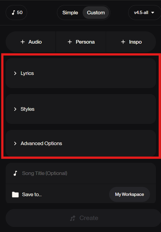 - Advanced:その他の設定(ボーカルの性別、歌詞の手動自動切換え、奇妙さ、スタイルの適応度)