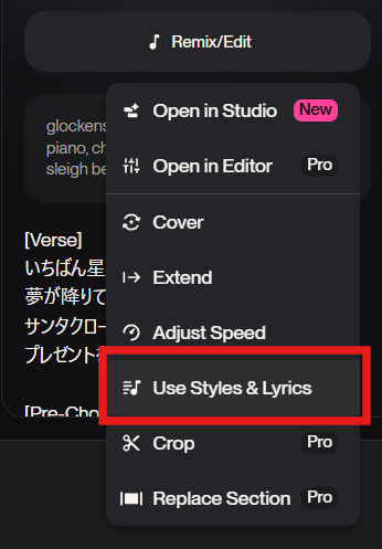 Use Styles & Lyrics 機能を使うと、生成した曲のプロンプトと歌詞をそのまま使って新しい楽曲を作成することができます。