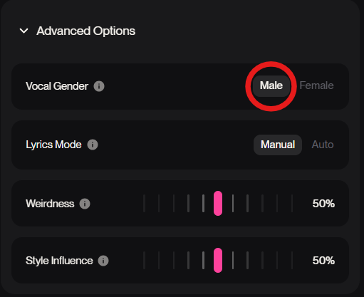 「Advanced Options」の欄から「Lyrics Mode」をAutoにして上記の指示文を入力します。