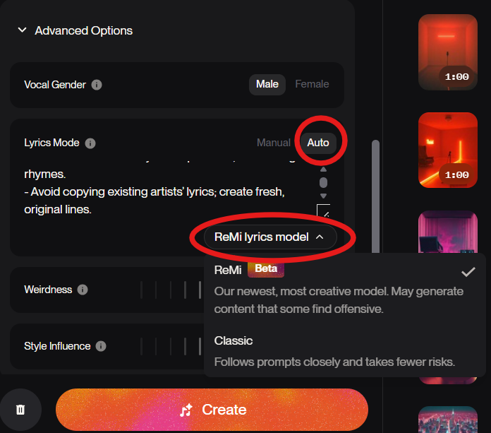 今回は歌詞生成でベータ版のReMiモードがあったので試してみます。
