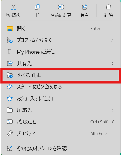 ダウンロードしたファイルを右クリックし、ファイルを展開します。
