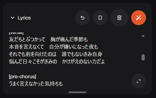 開かれた画面で歌詞についての要望を伝えていくとリアルタイムで歌詞を生成してくれます。