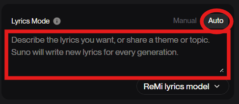 〇「Advanced Option」欄の「Lyrics Mode」をAutoにすると、歌詞についての指示を記載する欄が現れるので、歌詞についてのイメージやテーマを記述しましょう!