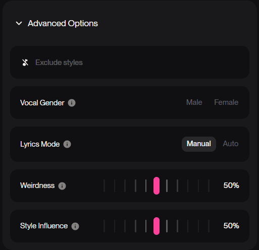 そのほかにも、ボーカルの性別やWeirdness(奇妙さ)、指定したプロンプトの影響をどの程度受けるかなど、シンプル(Simple)モードよりも細かく項目を設定することができます。