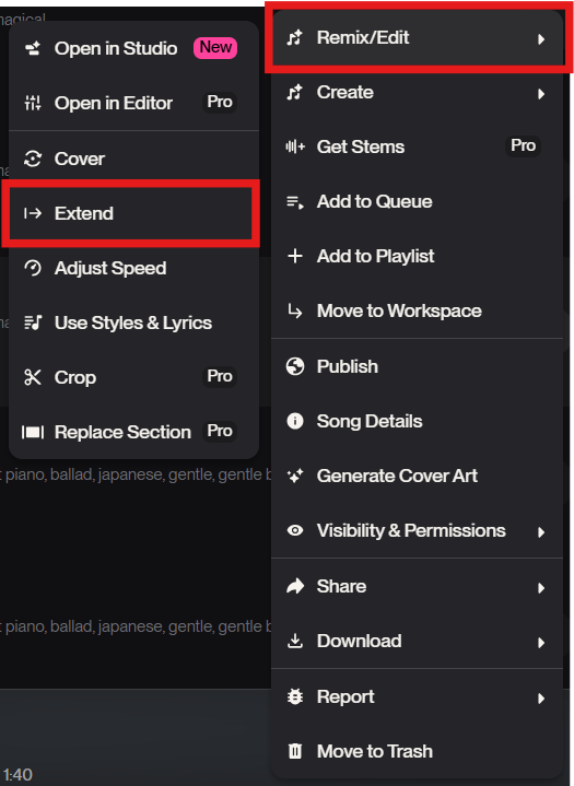 〇出てきたメニューから、「Remix/Edit」→「Extend」を選択します。