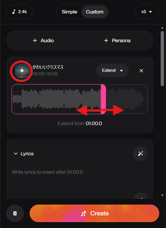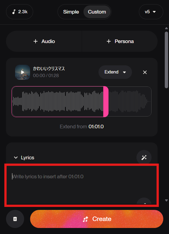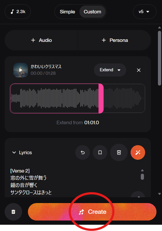 歌詞を生成することができたら、「Create」ボタンを押して延長後の楽曲を生成します。