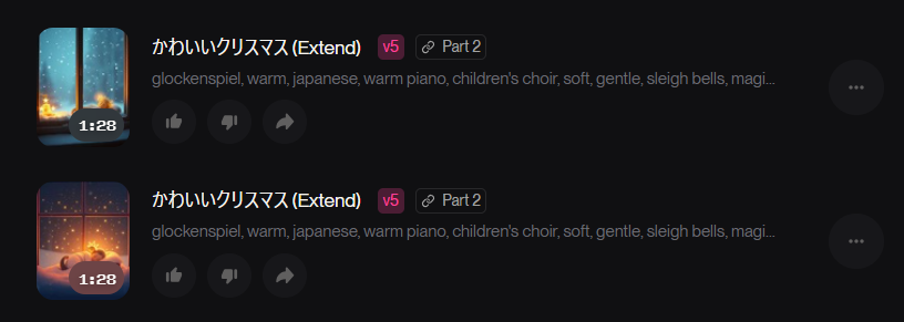 通常時と同様に2曲生成されるので、聞き比べて、延長前の曲と繋げた場合により良い方を選びましょう。