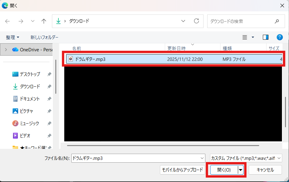 アップロードしたい音声のファイルを選択して、「開く」を押してアップロードします。
