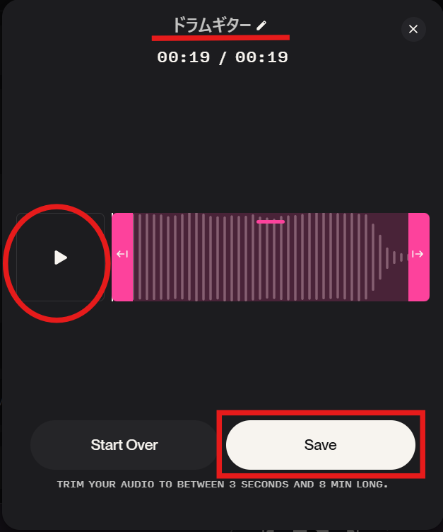 - 真ん中の音声モデルの端をドラッグすると、アップロードする音源の範囲を調整することができます。