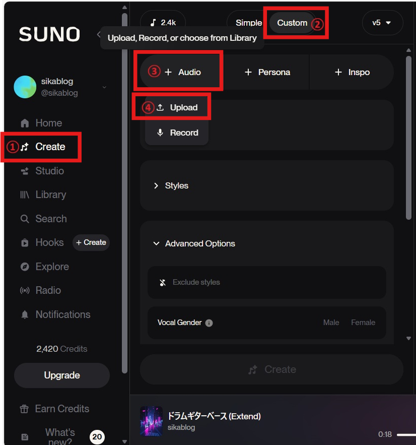 手順①Sunoから、アップロード画面を開く