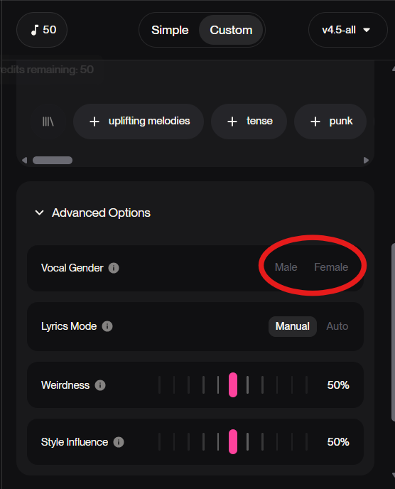 しかもこれ、有料版で提供されるv5のほう(v4.5-allのほうで同じ指示を出してみたら、正しく男性ボーカルで出力されました)での失敗なんですよね。