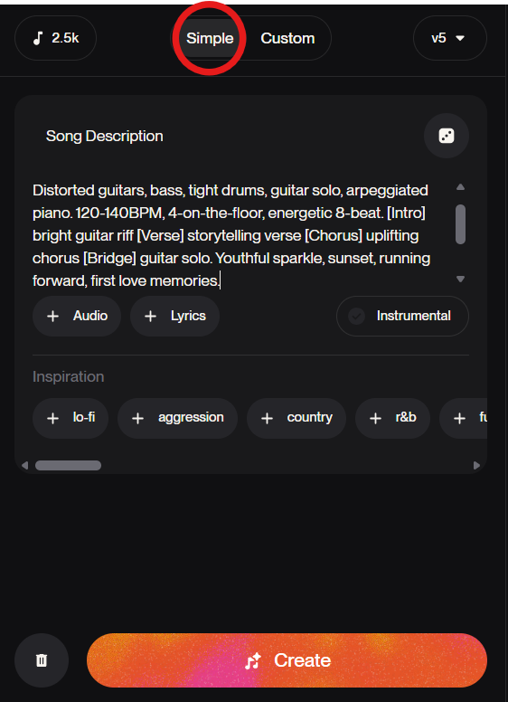 まずは、簡単な説明だけで曲を生成できる「Simpleモード」を使用して、