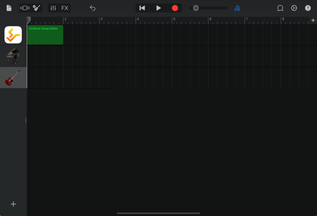 iOS版は1トラックのみの制限がありますが、VoiSonaアプリ単体で音声ファイルとして書き出してから、GarageBandでミックスする方法もあります。